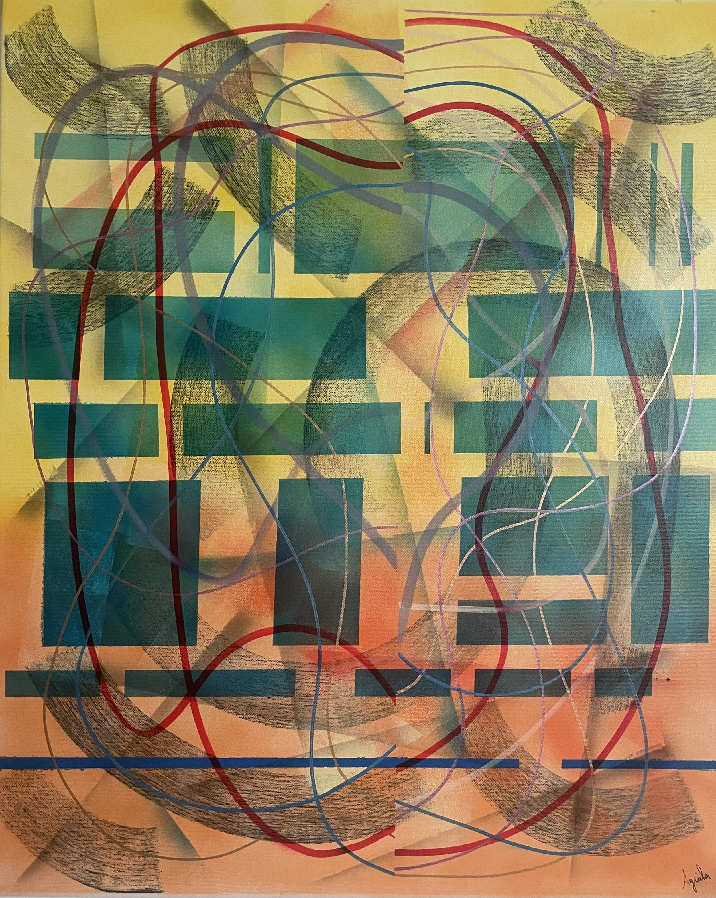 Nicolas Aguilar se distingue par ses œuvres abstraites à l’acrylique, où la géométrie rigoureuse reflète une quête intérieure profonde. À travers ces formes sculptées, il nous guide dans un voyage à travers les paysages de l’âme, où les réminiscences et les archétypes se rencontrent.